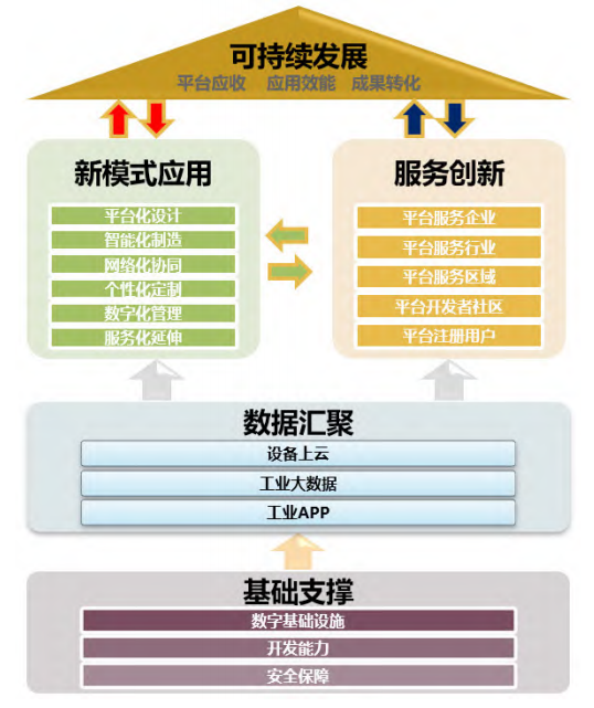 當前我國工業(yè)互聯(lián)網(wǎng)發(fā)展步入快車道,如何進一步發(fā)揮工業(yè)互聯(lián)網(wǎng)對制造業(yè)轉(zhuǎn)型升級的引擎作用是產(chǎn)業(yè)界面臨的新課題。本文主要從平臺對于數(shù)字化轉(zhuǎn)型的基礎支撐、數(shù)據(jù)匯聚、新模式應用、服務創(chuàng)新、可持續(xù)發(fā)展等五個方面展開如圖1所示?;A支撐作為基本能力為數(shù)字化轉(zhuǎn)型提供開發(fā)、技術、安全底座,數(shù)據(jù)匯聚能力體現(xiàn)平臺采集數(shù)據(jù)、交換數(shù)據(jù)、分析數(shù)據(jù)、應用數(shù)據(jù)水平,衡量數(shù)據(jù)要素作用和價值,平臺通過基礎支撐和數(shù)據(jù)匯聚迭代形成多樣化新模式新應用并拓展服務創(chuàng)新能力,有效驅(qū)動制造業(yè)數(shù)字化轉(zhuǎn)型和高質(zhì)量發(fā)展,最終在雙向循環(huán)下實現(xiàn)長期可持續(xù)發(fā)展。