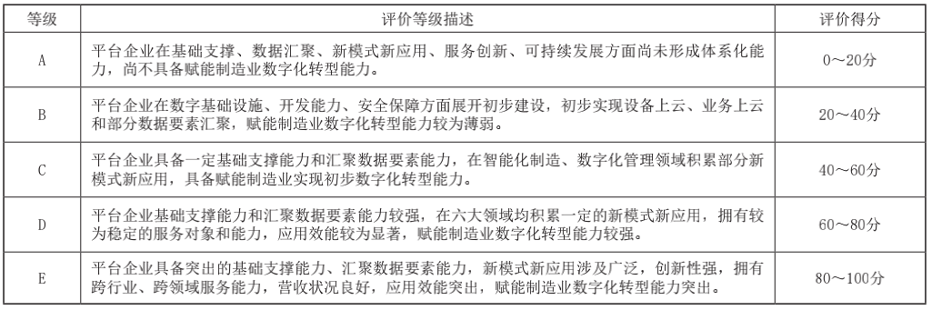 基于評價對象在工業(yè)互聯(lián)網(wǎng)平臺賦能制造業(yè)數(shù)字化轉(zhuǎn)型能力評價的總得分情況,結(jié)合基礎支撐、數(shù)據(jù)匯聚、新模式新應用、服務創(chuàng)新、可持續(xù)發(fā)展五方面能力水平綜合得分情況,將評價對象賦能制造業(yè)數(shù)字化轉(zhuǎn)型能力劃分為5個等級,各等級能力水平描述如下: