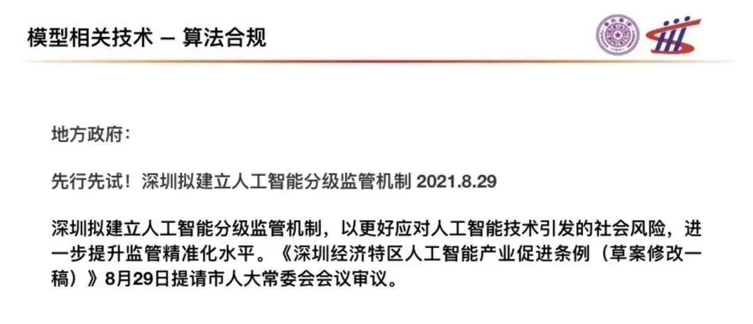 同時(shí)的,模型治理的另一面是算法的合規(guī)性。在數(shù)字經(jīng)濟(jì)時(shí)代,越來越多的生產(chǎn)活動(dòng)需要依靠算法模型開展,算法與業(yè)務(wù)的深度融合會(huì)是未來的趨勢(shì),對(duì)于業(yè)務(wù)的合規(guī)性要求也會(huì)傳導(dǎo)到對(duì)算法的合規(guī)性要求。在這方面,我們欣喜的看到深圳市已經(jīng)開始了先行先試,在今年8月份宣布擬建立人工智能分級(jí)監(jiān)管機(jī)制。