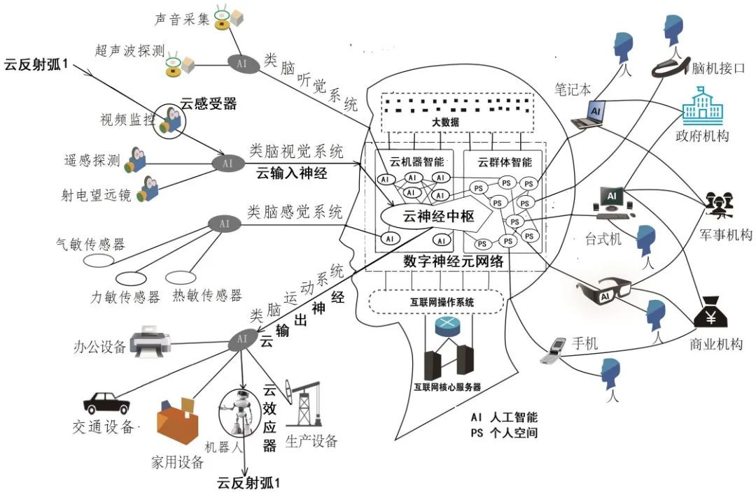 互聯(lián)網(wǎng)大腦是互聯(lián)網(wǎng)從網(wǎng)狀結(jié)構(gòu)向類腦結(jié)構(gòu)演化形成的一種新系統(tǒng),該系統(tǒng)在人類智慧和機器智能共同參與下,通過不斷演化形成數(shù)字神經(jīng)元網(wǎng)絡(luò)、云反射弧、數(shù)字視覺、數(shù)字聽覺、數(shù)字軀體感覺、數(shù)字運動神經(jīng)系統(tǒng)、數(shù)字記憶神經(jīng)系統(tǒng)、數(shù)字神經(jīng)中樞系統(tǒng)、數(shù)字自主神經(jīng)系統(tǒng)等組織,實現(xiàn)世界范圍人、物、系統(tǒng)和組織的的有效鏈接和協(xié)同工作,完成對世界的認(rèn)知、判斷、決策、反饋和改造,最終幫助人類社會更為有效地運行和發(fā)展。包括物聯(lián)網(wǎng)、云計算、工業(yè)互聯(lián)網(wǎng)、大數(shù)據(jù)、人工智能、區(qū)塊 鏈、云機器人、移動通信、虛擬現(xiàn)實、邊緣計算等數(shù)字技術(shù)的興起都與互聯(lián)網(wǎng)大腦的各神經(jīng)系統(tǒng)發(fā)育有關(guān)。