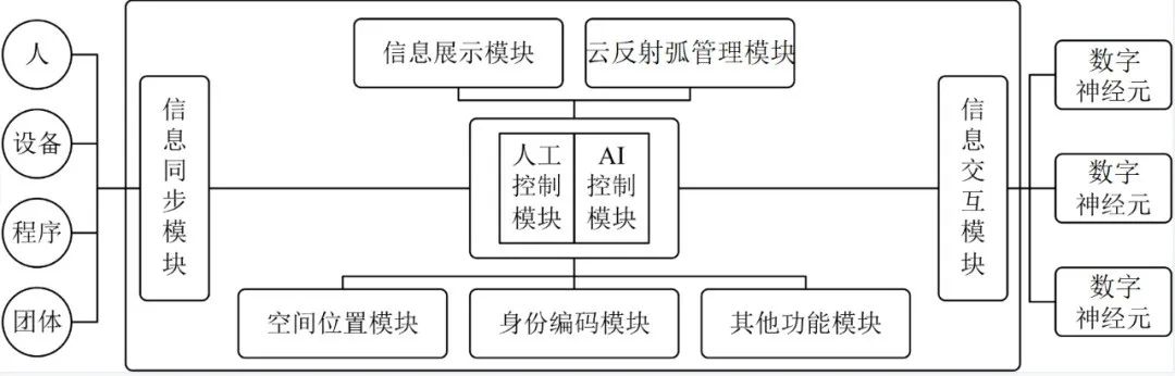 數(shù)字神經(jīng)元的功能模塊可以參考圖3所示,主要功能模塊包括信息同步模塊、信息展示模塊、信息交互模塊 、人工智能控制模塊、人工控制模塊、云反射弧管理模塊、空間位置編碼模塊、身份編碼模塊、以及其他功能模塊,每個模塊的具體含義可以參考本標(biāo)準(zhǔn)的具體內(nèi)容。