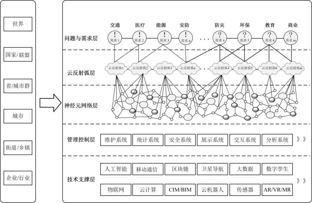 在建設(shè)總體架構(gòu)方面,標(biāo)準(zhǔn)提出了城市大腦的五層架構(gòu):包括問題需求層、數(shù)字神經(jīng)元層、云反射弧層、管理控制層和技術(shù)支撐層,提出所有的管理和技術(shù)應(yīng)圍繞問題需求層服務(wù)和發(fā)展,應(yīng)尋找最重要和最緊急的問題和需求進行處理,在問題和需求的約束下逐步擴大數(shù)字神經(jīng)元的覆蓋范圍,擴大云反射弧的應(yīng)用場景。使用的各種數(shù)字技術(shù)以滿足問題和需求的解決為準(zhǔn),避免城市大腦的盲目和無序發(fā)展,因為按照世界統(tǒng)一的數(shù)字神經(jīng)元網(wǎng)絡(luò)和云反射進行規(guī)劃,該建設(shè)總體架構(gòu)能夠同時滿足不同鄉(xiāng)鎮(zhèn)、城市、省、國家和世界的跨層級信息交互要求,如圖6所示。