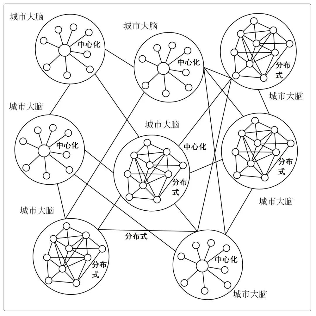 在城市大腦的部署架構(gòu)方面,標(biāo)準(zhǔn)提出城市大腦的建設(shè)可以采用中心化和去中心化(分布式)結(jié)合的方式,在具有統(tǒng)一規(guī)劃的市、省和國家內(nèi)部可以采用中心化的架構(gòu)布局,在不同城市,省和國家之間沒有形成統(tǒng)一的規(guī)劃前,由于互不隸屬,可以采用分布式的架構(gòu)布局,如圖7所示。