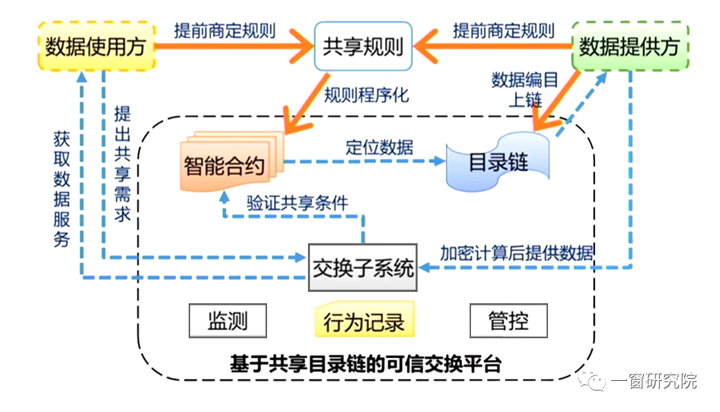 上圖,可以看到這個(gè)機(jī)制里面區(qū)分了數(shù)據(jù)使用方、數(shù)據(jù)提供方和共享管理方。在其中非常巧妙的加入了一個(gè)「目錄鏈」,這就把政府的職能和數(shù)據(jù)掛起鉤來(lái)。