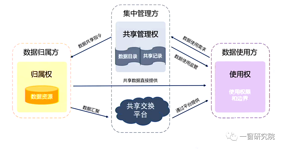 如下圖,我們通常說數(shù)據(jù)共享使用涉及到三個方面:①數(shù)據(jù)的擁有方或叫歸屬方;②數(shù)據(jù)的使用方;③對數(shù)據(jù)平臺行使管理職能的管理方。
