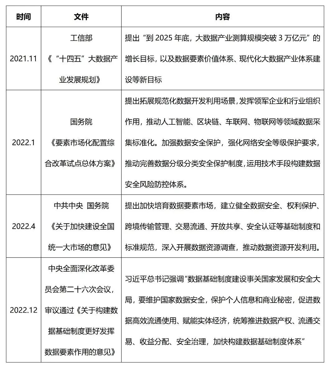 政策方面,中央、地方發(fā)布一系列支持文件,對大數(shù)據(jù)產(chǎn)業(yè)、數(shù)字技術(shù)、數(shù)據(jù)要素市場、數(shù)據(jù)安全等方面進行了重點部署。中央層面,2021年底,《“十四五”大數(shù)據(jù)產(chǎn)業(yè)發(fā)展規(guī)劃》的出臺明確了未來五年大數(shù)據(jù)產(chǎn)業(yè)發(fā)展工作的行動綱領(lǐng)。2022年,黨中央、國務(wù)院先后通過《要素市場化配置綜合改革試點總體方案》、《關(guān)于加快建設(shè)全國統(tǒng)一大市場的意見》、《關(guān)于構(gòu)建數(shù)據(jù)基礎(chǔ)制度更好發(fā)揮數(shù)據(jù)要素作用的意見》等文件,多次強調(diào)了釋放數(shù)據(jù)要素價值對于我國發(fā)展的必要性、緊迫性,為我國大數(shù)據(jù)發(fā)展提供了良好的政策環(huán)境和明確的發(fā)展目標。地方層面,31個?。▍^(qū)、市)均通過發(fā)布大數(shù)據(jù)專題規(guī)劃、數(shù)字經(jīng)濟總體規(guī)劃等形式,明確了各地大數(shù)據(jù)技術(shù)、產(chǎn)業(yè)、應用的發(fā)展路線圖、時間表,凸顯出各地在大數(shù)據(jù)布局方面的積極性。