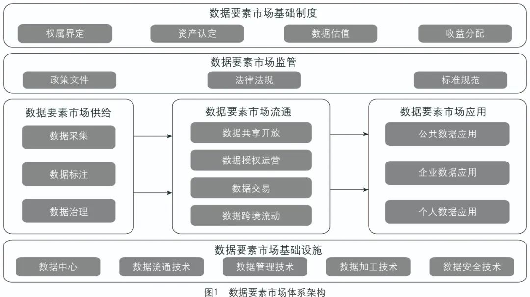 數(shù)據(jù)要素市場(chǎng)體系包括基礎(chǔ)制度、市場(chǎng)供給、市場(chǎng)流通、市場(chǎng)應(yīng)用、市場(chǎng)監(jiān)管、市場(chǎng)基礎(chǔ)設(shè)施等(參見(jiàn)圖1)。