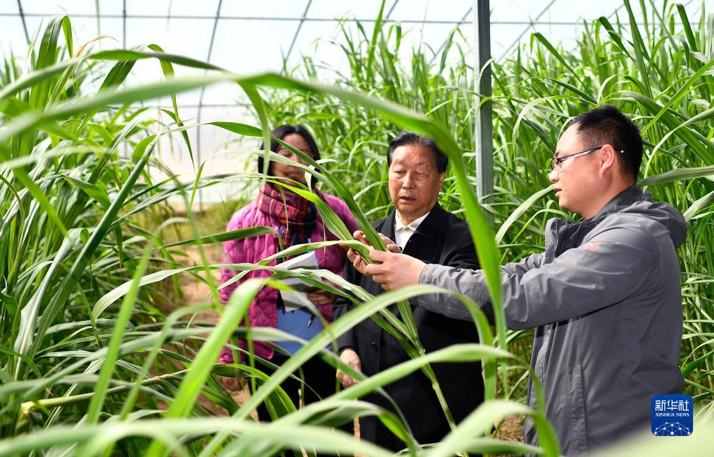 菌草專家林占熺(中)在寧夏銀川市永寧縣閩寧鎮(zhèn)農(nóng)戶劉昌富的大棚里查看菌草生長情況