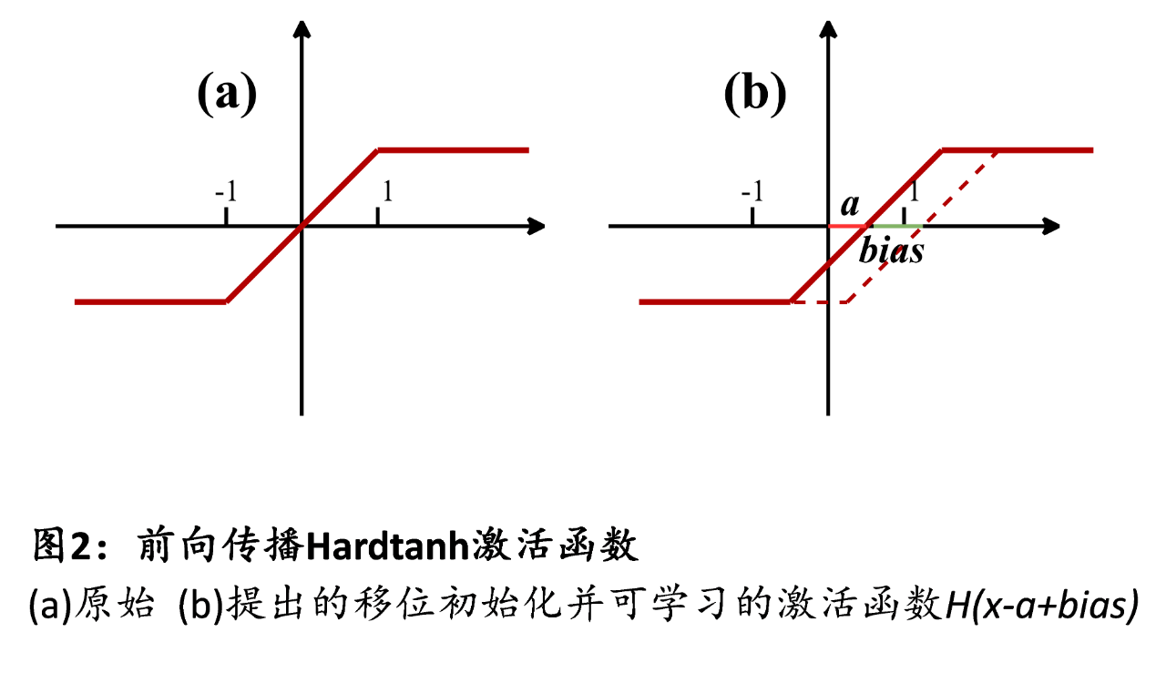 針對上述問題,感知中心科研團隊提出了一種用于語音喚醒的極輕量化、高準(zhǔn)確率的改進二值殘差神經(jīng)網(wǎng)絡(luò)B-ResNet(Binary Residual Neural Network,圖1),利用二值量化方法,將神經(jīng)網(wǎng)絡(luò)中的全精度權(quán)重、激活參數(shù)量化為1bit(+1,-1),顯著降低內(nèi)存占用,亦可將網(wǎng)絡(luò)中存在的大量浮點卷積乘加運算簡化為XNOR同或邏輯與popcount運算,大幅降低計算復(fù)雜度。為解決二值網(wǎng)絡(luò)帶來的精度下降問題,團隊在B-ResNet網(wǎng)絡(luò)前向傳播中提出了一種具有移位初始化且可學(xué)習(xí)的激活函數(shù)來優(yōu)化網(wǎng)絡(luò)各層激活值分布,降低信息損失(圖2),并在反向傳播過程中,提出了一種具有可變周期性窗口的梯度修正近似方法,有效解決了梯度失配與消失問題(圖3)。在GSCD(Google Speech Commands Dataset)標(biāo)準(zhǔn)語音數(shù)據(jù)集的12分類任務(wù)下,與基線網(wǎng)絡(luò)Res8-narrow相比,該技術(shù)可降低33%參數(shù)量與72%計算量,實現(xiàn)更高的語音喚醒精度,為后續(xù)該功能的低功耗硬件實現(xiàn)奠定了良好基礎(chǔ)。