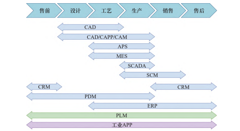 工業(yè)軟件主要分為設(shè)計(jì)研發(fā)類(lèi)工業(yè)軟件,如計(jì)算機(jī)輔助設(shè)計(jì)(CAD)、計(jì)算機(jī)輔助工程(CAE)、計(jì)算機(jī)輔助制造(CAM)、計(jì)算機(jī)輔助工藝(CAPP)等;信息管理類(lèi)工業(yè)軟件,如產(chǎn)品生命周期管理(PLM)、企業(yè)資源計(jì)劃(ERP)、生產(chǎn)執(zhí)行系統(tǒng)(MES)等;工業(yè)控制類(lèi)工業(yè)軟件,如數(shù)據(jù)采集與監(jiān)視控制系統(tǒng)(SCADA)、可編程邏輯控制單元(PLC)等。在工業(yè)產(chǎn)品的全生命周期內(nèi),需要多類(lèi)工業(yè)軟件的協(xié)同合作,因而跨軟件的數(shù)據(jù)互操作極為重要。