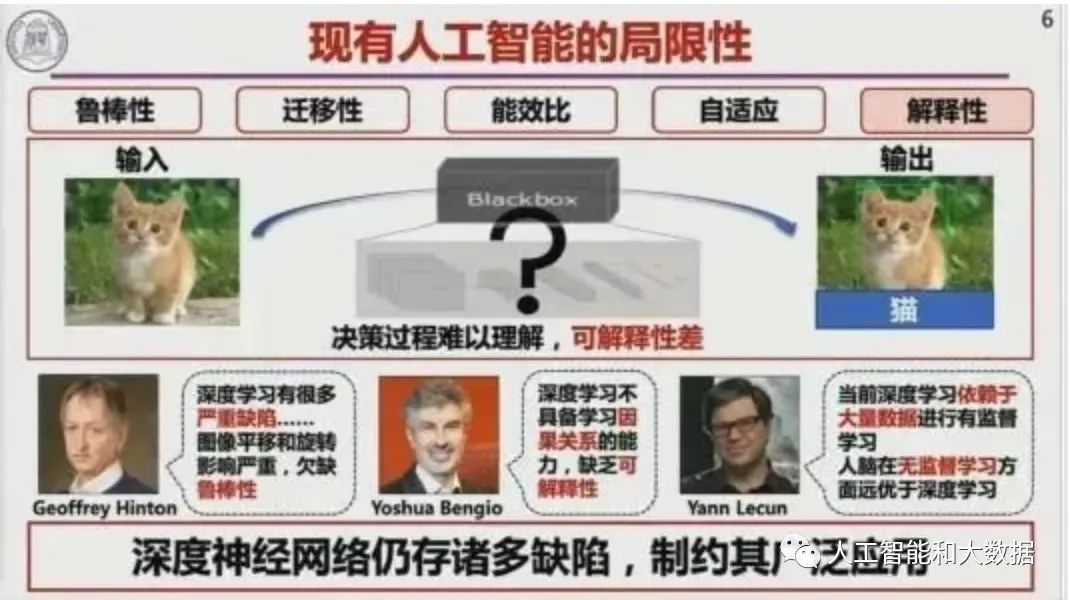 同時,我們更應看到人工智能的局限性:其一,自動駕駛領域中人工智能的相關(guān)應用,已經(jīng)凸顯了其在魯棒性、遷移性及能效比等方面的問題;其二,在醫(yī)療領域中的應用凸顯了人工智能算法自適應能力的局限,清華大學跟301醫(yī)院合作,用20萬條男性50歲的腦卒數(shù)據(jù)做訓練,但在做預測時發(fā)現(xiàn)對女性腦卒疾病的預測準確度并不高;其三,人工智能可解決一定的問題,但其工作原理還沒有明確的可解釋性。