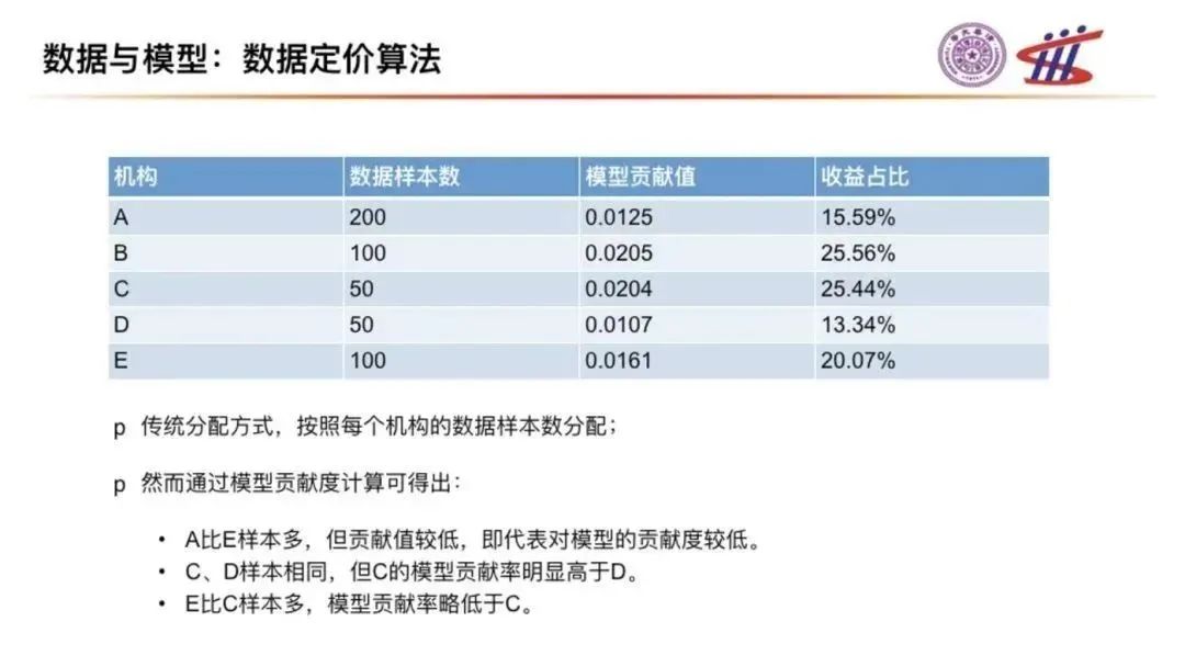 這些經(jīng)濟(jì)效率的提升是基于模型精度的提升,比如精度高一倍的營(yíng)銷模型就可以幫助機(jī)構(gòu)獲得多一倍的業(yè)務(wù)量,這些業(yè)務(wù)的經(jīng)濟(jì)價(jià)值是由于使用了多方的數(shù)據(jù)要素,并建立了更高精度的模型帶來的。那么我們就可以通過多方數(shù)據(jù)合作博弈的框架,建立分配算法,按照貢獻(xiàn)度公平合理地分配這些價(jià)值。誰(shuí)的數(shù)據(jù)對(duì)模型精度以及相關(guān)聯(lián)的經(jīng)濟(jì)價(jià)值貢獻(xiàn)度高,誰(shuí)就應(yīng)該獲得相應(yīng)更多的經(jīng)濟(jì)價(jià)值。