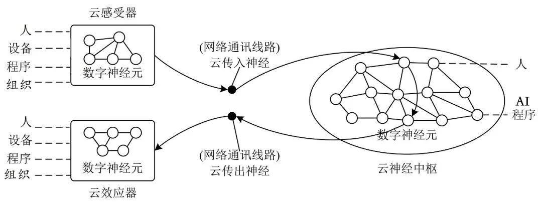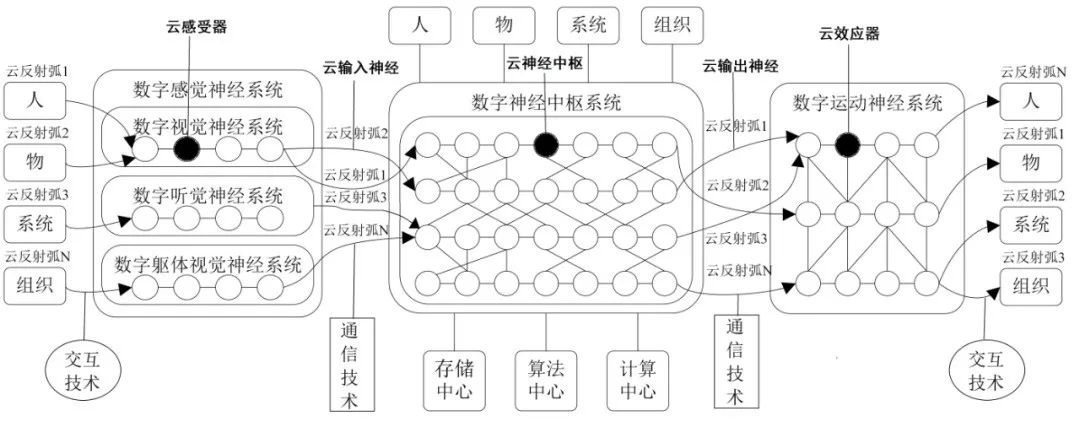 云反射弧是多種數(shù)字神經(jīng)元按照類神經(jīng)系統(tǒng)的反射弧原理形成的協(xié)同工作技術(shù)鏈條,由擔(dān)任感受器、傳入神經(jīng)、神經(jīng)中樞、傳出神經(jīng)和效應(yīng)器的數(shù)字神經(jīng)元聯(lián)合組成,對應(yīng)解決城市和人類社會的具體問題和需求。