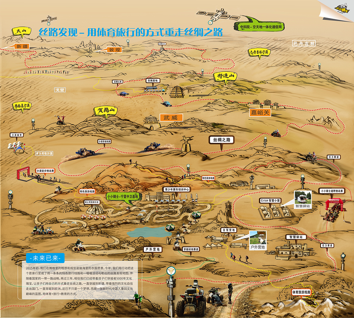 以庫(kù)木塔格沙漠為營(yíng)地進(jìn)行特色線路策劃開(kāi)發(fā),形成絲路文化、民俗特色、西域地貌特色的體育旅游、研學(xué)線路。通過(guò)綜合性產(chǎn)品的 打造、進(jìn)行整體消費(fèi)升級(jí)、填補(bǔ)市場(chǎng)空缺、實(shí)現(xiàn)資源整合用戶(hù)聚集。