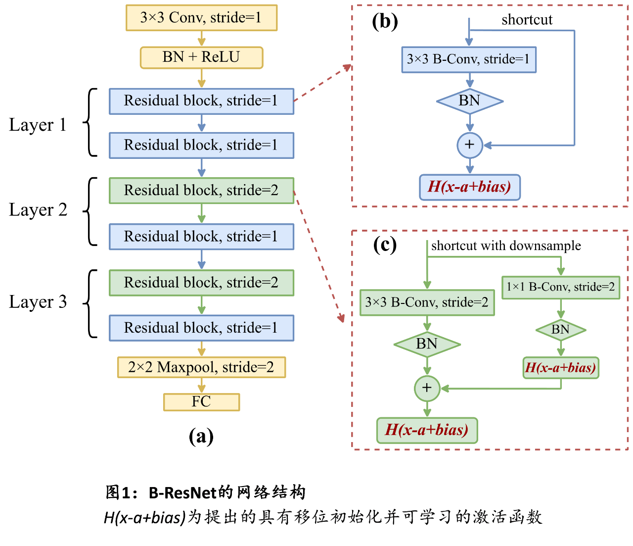 針對上述問題,感知中心科研團隊提出了一種用于語音喚醒的極輕量化、高準(zhǔn)確率的改進二值殘差神經(jīng)網(wǎng)絡(luò)B-ResNet(Binary Residual Neural Network,圖1),利用二值量化方法,將神經(jīng)網(wǎng)絡(luò)中的全精度權(quán)重、激活參數(shù)量化為1bit(+1,-1),顯著降低內(nèi)存占用,亦可將網(wǎng)絡(luò)中存在的大量浮點卷積乘加運算簡化為XNOR同或邏輯與popcount運算,大幅降低計算復(fù)雜度。為解決二值網(wǎng)絡(luò)帶來的精度下降問題,團隊在B-ResNet網(wǎng)絡(luò)前向傳播中提出了一種具有移位初始化且可學(xué)習(xí)的激活函數(shù)來優(yōu)化網(wǎng)絡(luò)各層激活值分布,降低信息損失(圖2),并在反向傳播過程中,提出了一種具有可變周期性窗口的梯度修正近似方法,有效解決了梯度失配與消失問題(圖3)。在GSCD(Google Speech Commands Dataset)標(biāo)準(zhǔn)語音數(shù)據(jù)集的12分類任務(wù)下,與基線網(wǎng)絡(luò)Res8-narrow相比,該技術(shù)可降低33%參數(shù)量與72%計算量,實現(xiàn)更高的語音喚醒精度,為后續(xù)該功能的低功耗硬件實現(xiàn)奠定了良好基礎(chǔ)。